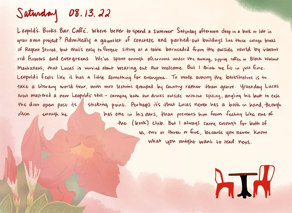 Leopold’s. Books. Bar. Caffe. Where better to spend a summer Saturday afternoon deep in a book or lost in your own project? Admittedly a gauntlet of concrete and partied-out buildings line these college blocks of Regent Street, but that’s easy to forget sitting at a table barricaded from the outside world by vibrant red flowers and evergreens. We’ve spent enough afternoons under the awning, sipping coffee or Black Walnut Manhattans, that Lucas is worried about wearing out our welcome. But I think we fit in just fine. Leopold’s feels like it has a little something for everyone. To walk among the bookshelves is to take a literary world tour, with most sections grouped by country rather than genre. Yesterday Lucas even mastered a new Leopold’s skill — carrying both our drinks outside without spilling, angling his butt to ease the door open past its sticking point. Perhaps it’s that Lucas never has a book in hand, though often enough he has one in his ears, that prevents him from feeling like one of the (book) club. But I always carry enough for both of us, two or three or five, because you never know what you might want to read next.