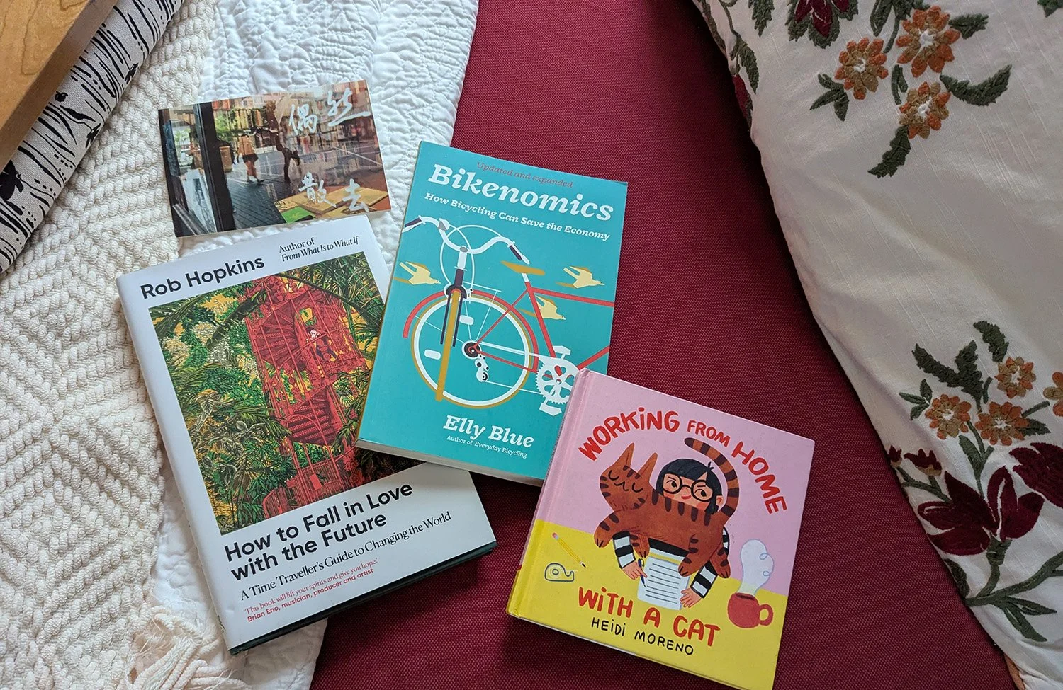 Raise your hand if you need a little sunshine in your life after that last section, or just generally. Me too, and I found it at the used bookstore (thanks, The Book Deal). My bookstore treasure hunt resulted in a postcard of a bookstore in Hong Kong, How to Fall in Love with the Future: A Time Traveller’s Guide to Changing the World by Rob Hopkins, Bikenomics: How Bicycling Can Save the Economy by Elly Blue, and Working from Home with a Cat by Heidi Moreno.